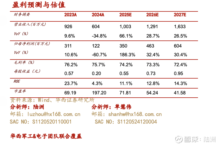 公司是国内特种芯片核心厂商,特种领域有望充分受益电子战背景下新机放量提质,以及低轨卫星需求的迅速释放;民用领域,公司打造AI算力芯片,布局机器人、AR/VR头盔、AI眼镜等尖端赛道,打开成长空间。我们维持盈利预测,预计2025-2027年公司营业收入分别为10.03/12.91/16.33亿元,归母净利3.50/4.63/6.04亿元,同比增速+186.3%/32.4%/30.4%,EPS 0.55/0.73/0.95元。对应2025年12月19日39.44元/股收盘价,PE分别为72/54/42倍,维持“买入”评级。