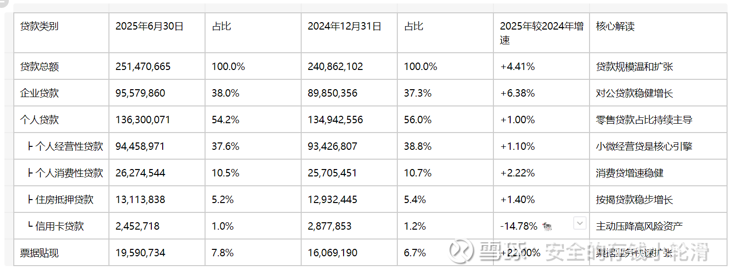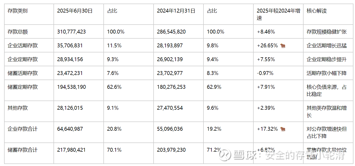 企业存款增速17.32%(高于储蓄存款6.87%)→ 对公业务是增长点,但零售仍是绝对主体。