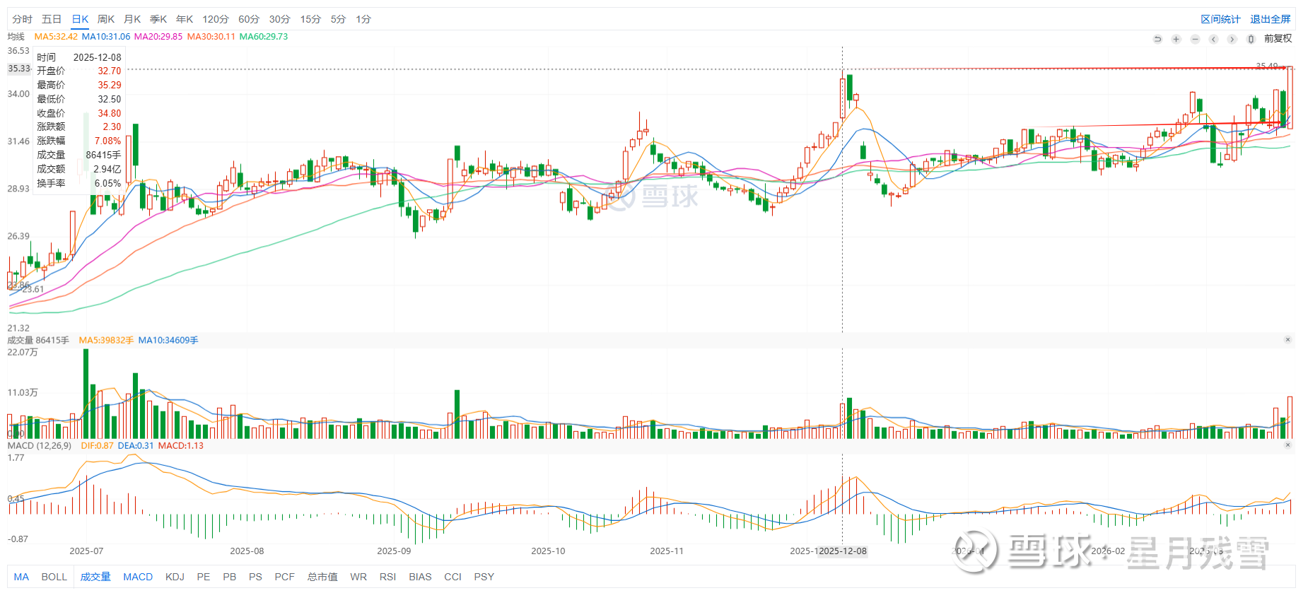 短期走势:今日股价强势涨停,收于35.49元,涨幅10.01%,创下近期新高。成交额3.59亿元,换手率7.21%,市场交投极为活跃。