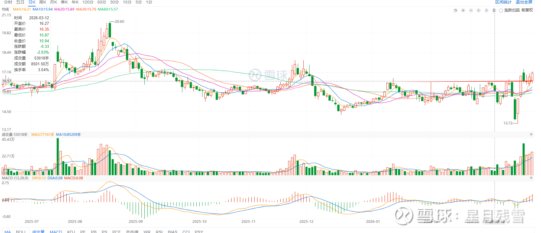 短期走势:今日收盘17.13元,上涨1.66%,换手率高达16.23%,成交额4.80亿元,显示市场交投极为活跃。今年以来股价累计上涨13.75%,表现强于大盘。