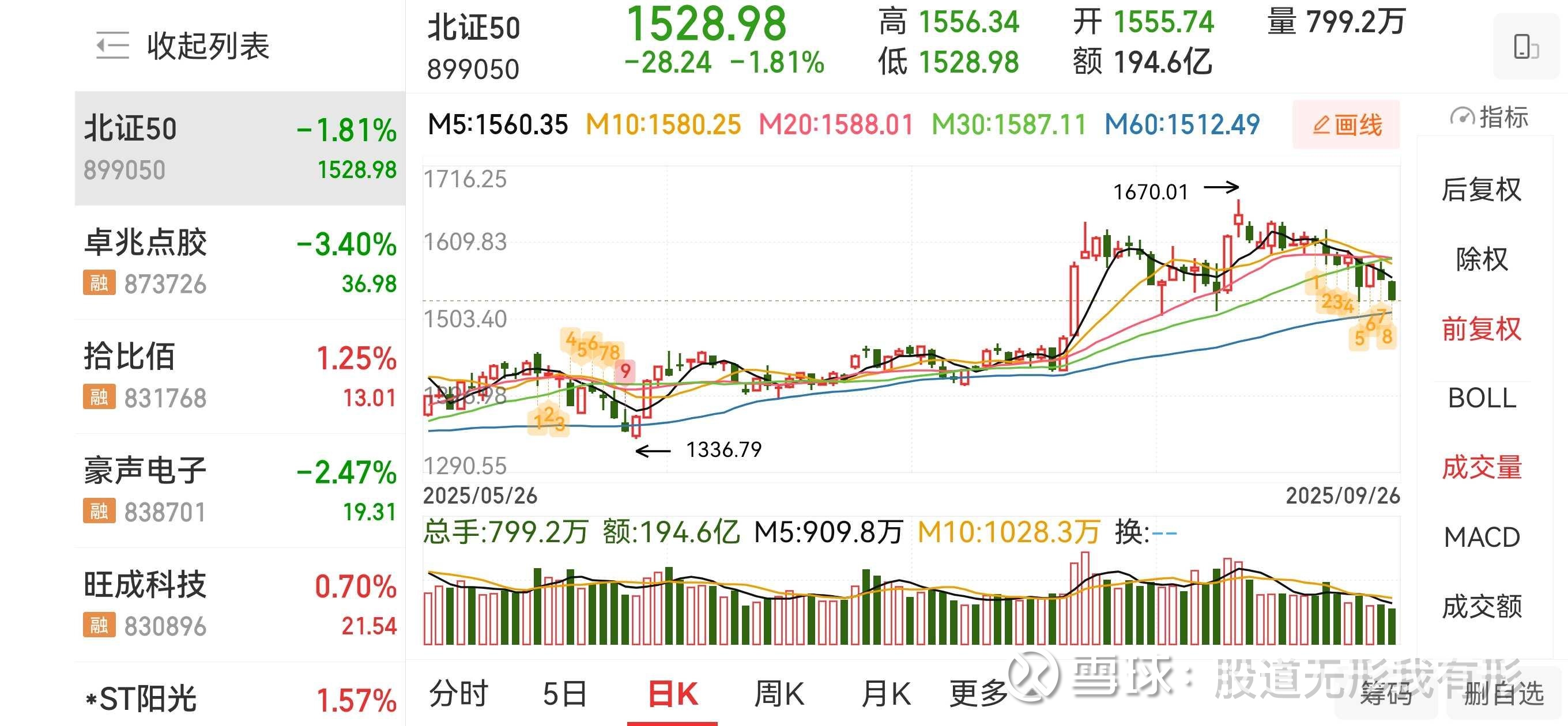 2025年9月26日,北证50收盘1528.98点,跌-1.81%,换手8.63%,成交194.56亿元。是2025年8月4日以来首次跌破200亿元日成交。地量地价,历史上每次地量都迎来反弹。2025年7月7日地量185亿元日成交,几日内从1398反弹到1466。2025年8月4日地量198亿元日成交,北证50从1410点反弹到1670点。此次地量后,北证50将在10月份突破1700,向1800前进!