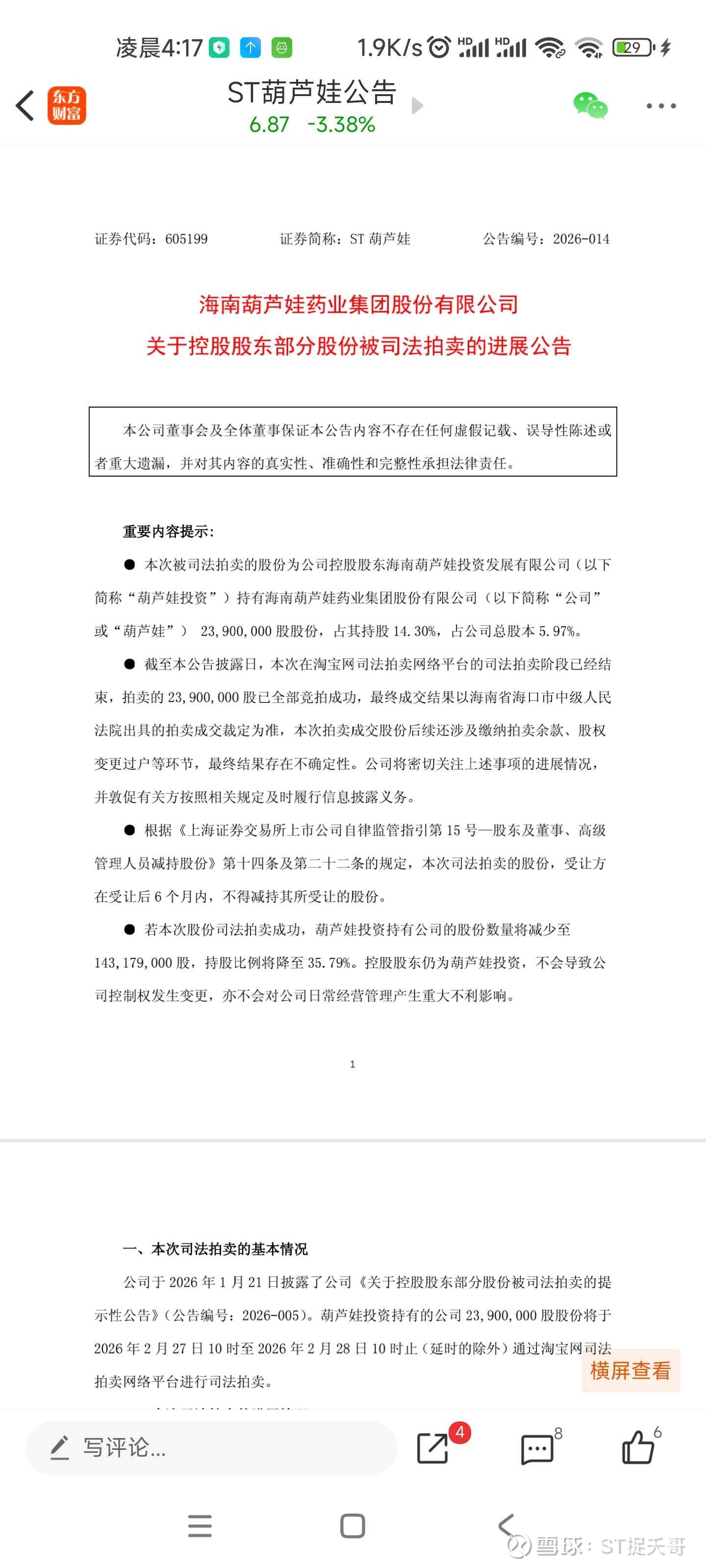 1. 拍卖规模与性质:控股股东海南葫芦娃投资发展有限公司所持23,900,000股被司法拍卖,占其持股14.30%,占公司总股本5.97%。本次拍卖已全部竞拍成功,后续仍需完成缴款、过户等环节,最终结果存在一定不确定性。