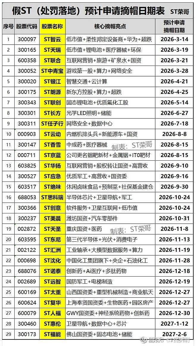 - 3月主力:ST智云、ST天瑞、ST联合,这三家是首批摘帽候选,3月中旬到下旬集中申请,关注公告里的整改完成证明和财报重述数据。