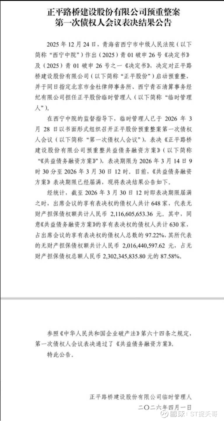 最后再啰嗦一句:ST正平共益债通过,是数据+规则+公告三重验证的实锤,一债会公告的真实性也没问题,持股的朋友放宽心,静待重整落地就好。