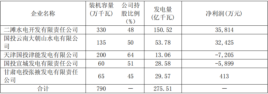 重组收购的国投电力有限公司投资的5个发电企业,主要是两个水电站盈利能力突出,净利润分别是3.58亿、3.24亿。其中二滩水电开发有限公司后更名为雅砻江流域水电开发有限公司。