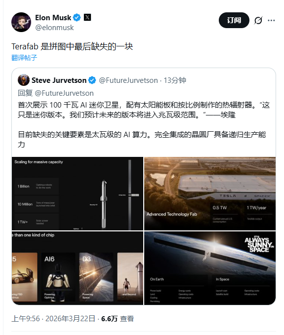 3月21日马斯克官宣SpaceX与特斯拉联合发布TERAFAB项目,目标年产超1太瓦算力(逻辑+存储+封装),80%用于太空、20%用于地面。叠加路透社曝光特斯拉200亿元采购中国光伏设备,芯片+光伏两条主线共振。