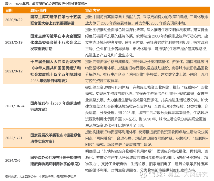 虎哥是全国“无废城市”的先行者,自成立以来,积极调研、持续投入、不断摸索,创新性地将互联网、物联网、大数据等技术与居民家庭生活废弃物回收相结合,围绕“数字城市”现代环境治理体系建设,打造“无废城市”,提供生活垃圾减量化、资源化和无害化服务,建立了“前端收集一站式,循环利用一条链,智慧监管一张网”的“互联网+”居民家庭生活废弃物回收体系。公司于2021年12月率先完成了生活垃圾可回收物碳减排量(CCER)方法学论证,并成功接入浙江省“浙里办”、“浙政钉”政务平台。2022年4月,虎哥的“虎哥数字城市生活垃圾分类治理服务场景”入选2021年度浙江省人工智能典型应用场景和优秀解决方案(产品)名单。此外,“虎哥模式”亦被列入浙江省首批“无废城市”适用先进技术名单,并向全浙江省推广。
