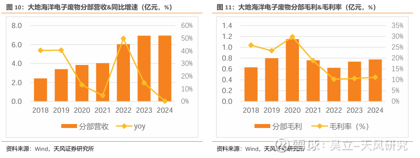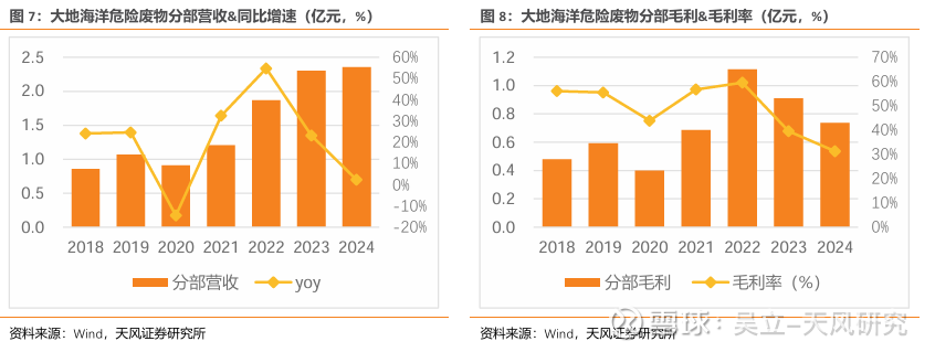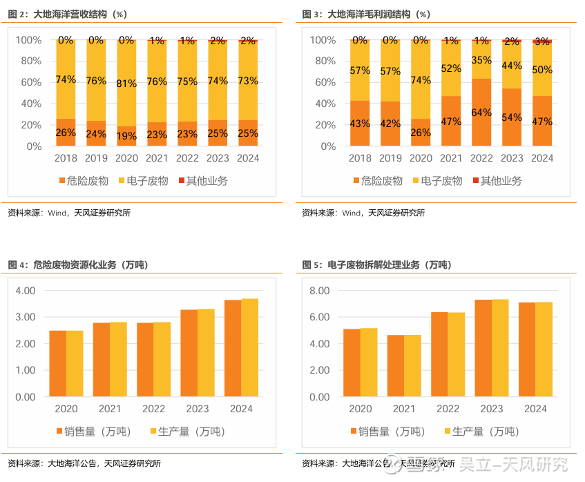 目前,公司的危险废物业务主要由大地海洋运营,电子废物业务主要由子公司盛唐环保运营。其中电子废物业务是支撑营收的主力,2024年贡献约73%的营收;危险废物业务和电子废物业务对利润的贡献差距不大,2024年分别为47%和50%。
