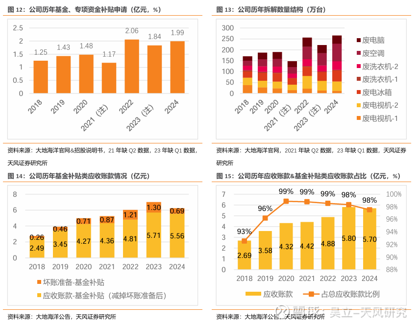 基金补贴和专项资金是公司电子废物分部业务营收中的重要组成。根据《废弃电器电子产品处理基金补贴标准》和公司公告测算,公司2018-2024年可申请基金补贴整体呈现稳定增长状态,2018-2024年CAGR为8.08%。根据国家财政部公布的《2025年废弃电器电子产品处理专项资金预算表》,2025年废弃电器电子产品处理专项资金共50亿元,少于2024年执行数75亿元。其中,用于发放原废弃电器电子产品处理基金制度时尚未补贴的资金额度为23亿元,“以奖代补”支持行业发展的资金额度为27亿元。其中基金补贴制度时尚未补贴的资金额度中归属于公司的金额为5,996万元;“以奖代补”专项资金中2024年度金额中归属于公司的金额为7,903.57万元,合计13,899.57万元。从应收账款来看,公司应收账款主要由应收拆解处理基金和专项资金构成,应收拆解处理基金和专项资金无法收回的风险极小,发生的信用损失主要为由于回款周期较长导致的时间价值损失。截至2024年报,公司尚有应收账款5.56亿元为未发放的基金和专项资金补贴。