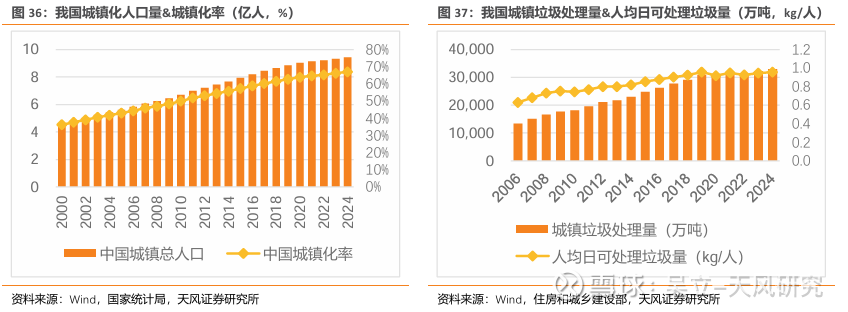 随着我国城镇化的不断推进,近几年来“垃圾围城”的问题日益突出。根据国家统计局数据,2024年我国城镇化总人口量为9.44亿人,城镇化率67%,2000-2024年CAGR为3.05%;根据住房和城乡建设部数据,2024年我国城镇垃圾处理量为3.29亿吨,2006-2024年CAGR为5.12%,较同期城镇人口增速高2.41pct,而人均日可处理垃圾量仅为0.96千克,2006-2024年CAGR仅为2.34%,较同期城镇人口增速低0.37pct,可见我国城镇垃圾处理能力和城镇化人口的不断增长尚不匹配。