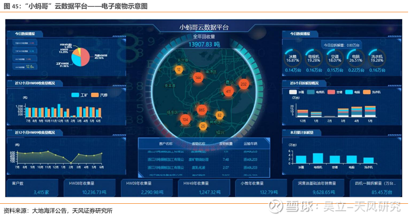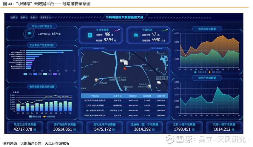 我们认为,废弃资源利用行业是能够产生海量数据的劳动密集型行业,数字技术和人工智能的发展将有助于推动行业的转型升级、诞生更加高效和高盈利的商业模式。以大地海洋为例,公司开发了拥有自主知识产权的“小蚂哥”云数据平台,创造性地将互联网与物联网技术应用于危险废物的回收、利用和处置的全过程,实现了危险废物从收集、运输、生产、销售的全流程跟踪和大数据汇总。公司是业内少数几家将数字技术应用于危险废物全生命周期管控的企业。