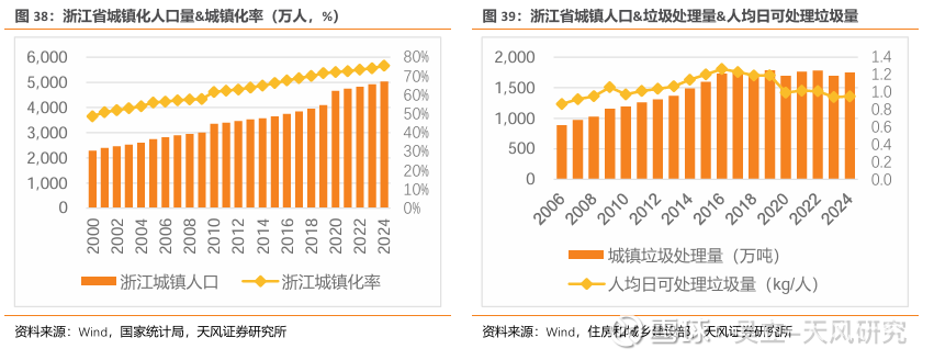 公司业务主要在浙江省内开展:根据国家统计局数据,2024年浙江省城镇化总人口量为0.50亿人,城镇化率75.5% ,2000-2024年CAGR为3.36%,较同期全国增速高0.31pct;根据住房和城乡建设部数据,2024年浙江省城镇垃圾处理量为0.17亿吨,2006-2024年CAGR为3.84%,较同期城镇人口增速高0.56pct,对应人均日可处理垃圾量为0.95千克,2006-2024年CAGR为0.54%,较同期城镇人口增速低2.74pct,由此可见,浙江省拥有较我国总人口更高的城镇化速度和更高的城镇化率,然而人均垃圾处理能力增速与高增长的人口并不匹配,这为公司发展提供了广阔的空间。