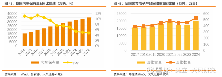 2)以“四机一脑”为主的电子废物。根据同花顺数据,2024年我国废弃电子产品回收数量2.2亿台,2017-2024年CAGR为4.31%,2024年对应重量485万吨。随我国居民消费水平增长,叠加数字技术快速发展使居民生活不断便捷化的背景,我们预计电子废物处理业务或将长期处于增长期。