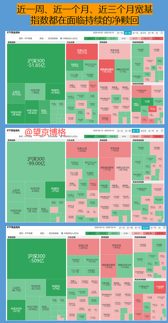 博格把近一周、近一个月、近三个月ETF净申赎数据汇总跑了一下,结果挺有意思:沪深300ETF近三个月净赎回509亿,近一个月净赎回99亿,近一周净赎回52亿,说明有400亿沪深300ETF的规模是一个月前赎回的。科创50ETF近三个月赎回474亿,近一个月净赎回475亿,近一周净赎回44亿,说明有430亿科创50ETF的规模是近一个月赎回的。结果很清晰,这些规模都是在这些指数涨幅最大的时候被赎回的。大概率不是国家队所为,而是之前定投抄底的投资者,回本了或者赚钱了开始止盈了,历史上基本都是这样。无论如何宽基指数ETF基本都是被大规模赎回的,赎回的资金也没有跑,而是进入证券公司、人工智能、机器人等细分赛道,另外港股ETF在持续净申购了,而且规模很大。现在人工智能、机器人累计涨幅不小了,资金又开始止盈了。接下来是不是该港股大涨了? 关注博格,我们来持续更新这个ETF净申赎数据。