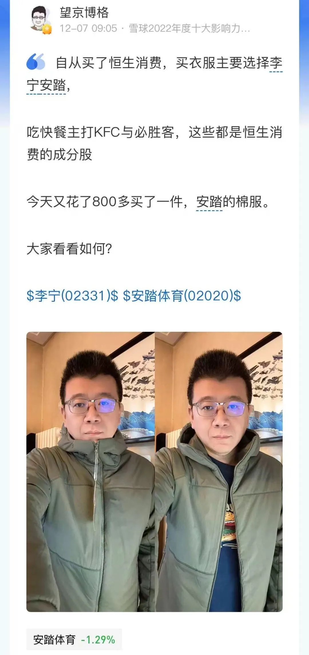 现在买衣服都买安踏的,买鞋都买李宁的,有肯德基一定不吃麦当劳,这些都是恒生消费的成分股。