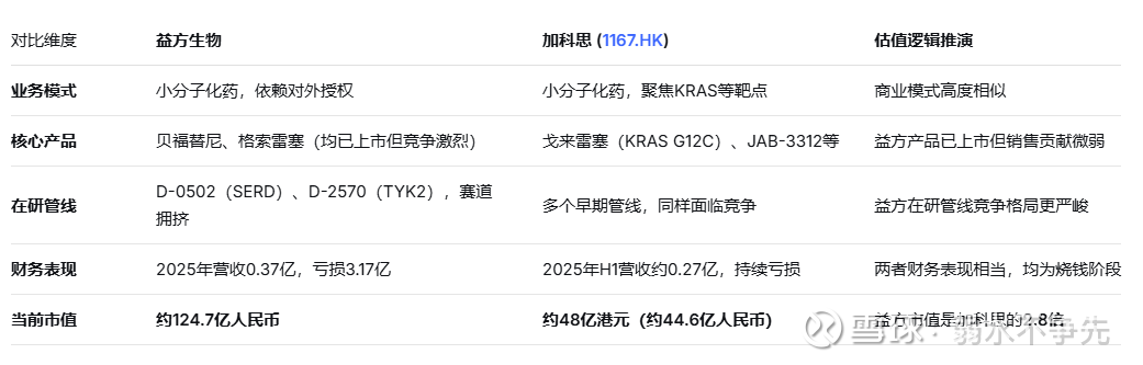 核心判断:加科思的市值(约48亿港元)可作为益方生物的估值锚点。考虑到益方拥有两款已上市产品,在管线进度上略有优势,可给予10%-20%的溢价。因此,益方生物的合理估值应在 50-60亿元人民币 之间。