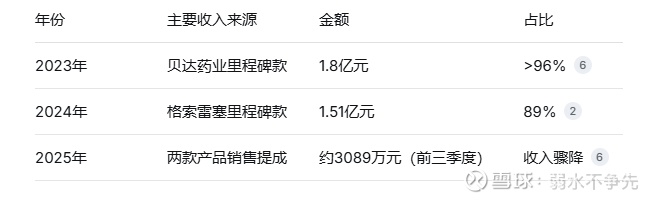 里程碑款断流:2023年营收的96%来自贝达药业的1.8亿元里程碑款;2024年收入重心转向格索雷塞的1.51亿元里程碑款。