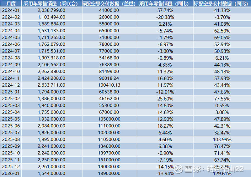 2025年中国乘用车零售销量2374.4万辆,同比增长3.75%,其中空悬标配车型销量127.3万量,同比增长56.1%。从乘用车逐月销量看,2025年10M开始乘用车销量同比逐步下滑,而配套空悬车型销量仍然同比高增,这与补贴退坡对中高端车型影响较小、产品投放节奏以及商家购置税兜底存在关系。总体来讲补贴退坡和购置税减半对购买中高端车型消费者倾向影响较小。
