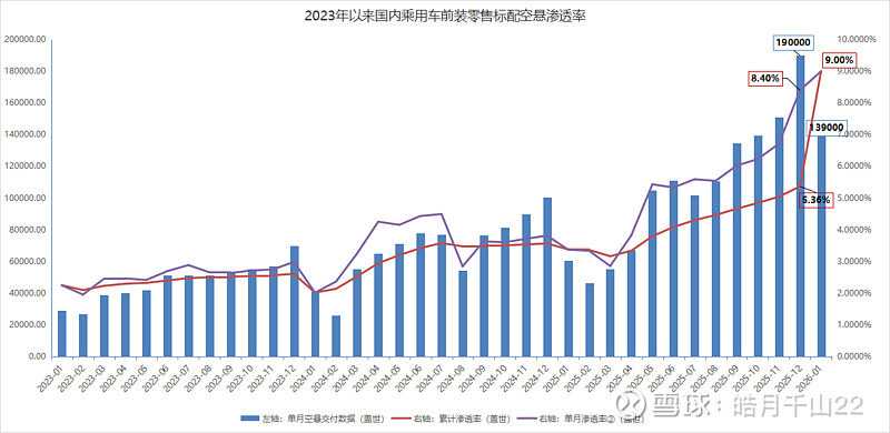 2025年空悬累计渗透率达到5.36%,12月当月渗透率达到8.4%,均创历史新高,并于26年1月份再创新高达到9%。