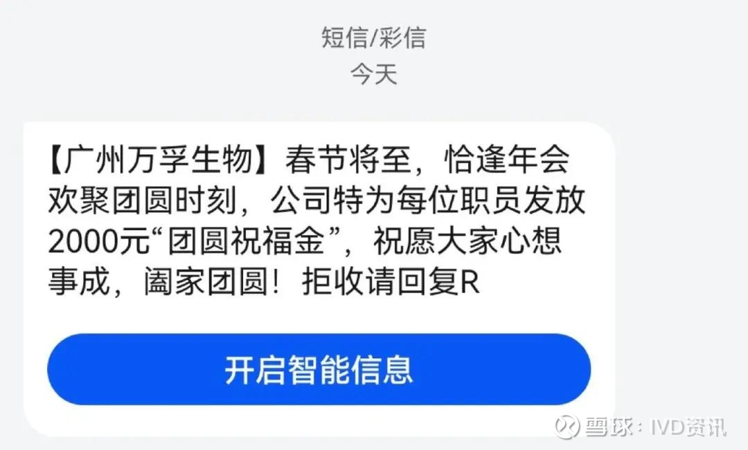 大会期间,万孚向全体员工发放2000元“团圆祝福金”。相关短信中写道:“春节将至,恰逢年会欢聚时刻,公司特为每位职员发放2000元团圆祝福金,祝愿大家心想事成,阖家团圆。”