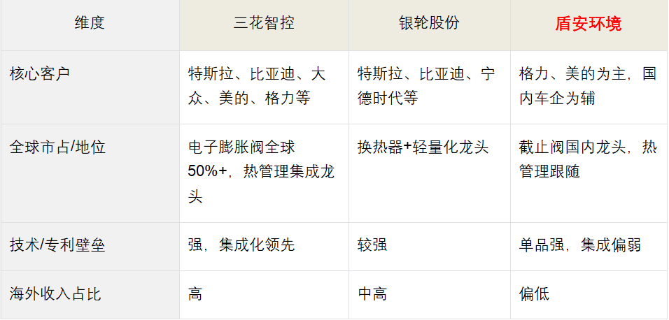 三花、银轮是全球一线车企核心供应商;盾安更多是国内家电供应链龙头。