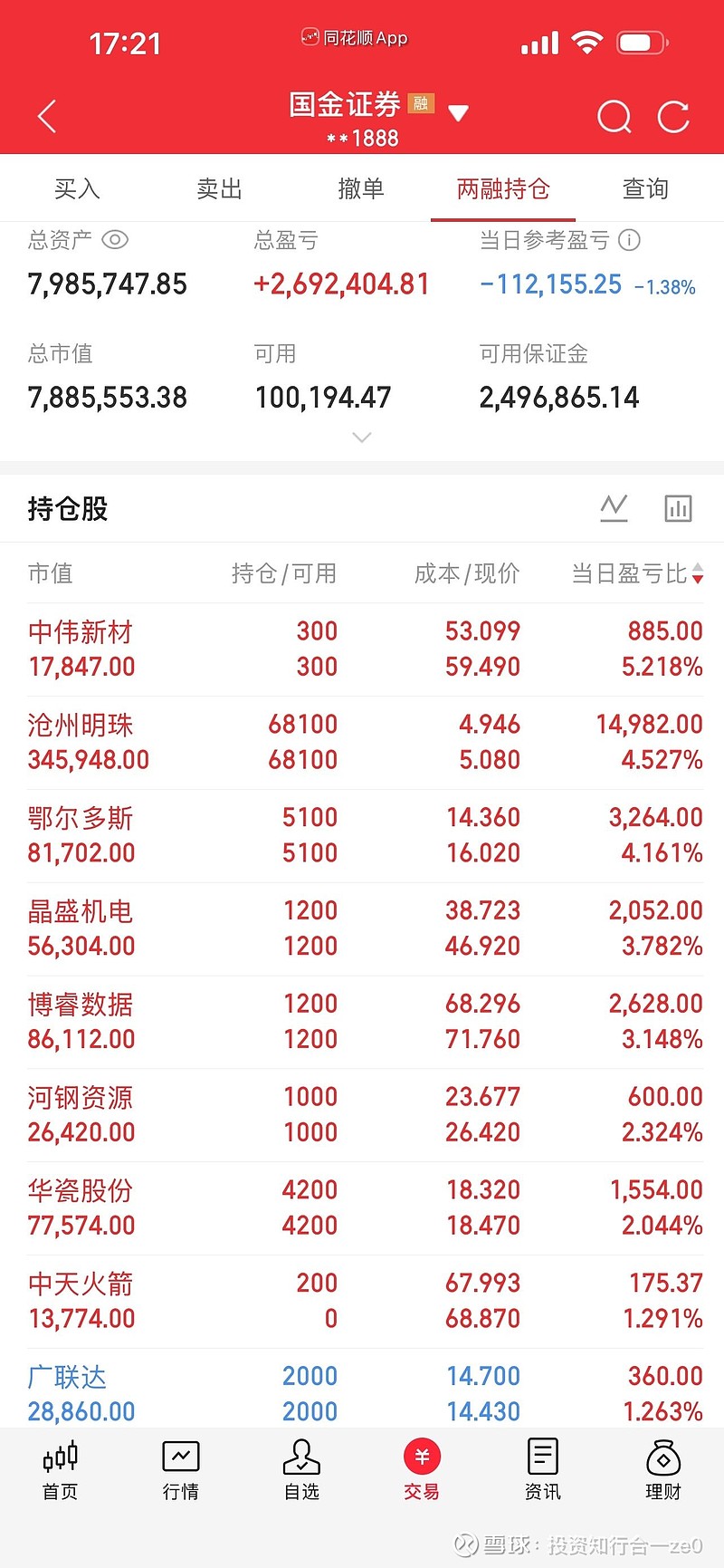 盛T今日表现太垃圾了,期铜都拉了6.71%,它竟然绿2.14%收盘,如果其它铜矿股都下跌还情有可原,可其它个股都大涨,涨停的也不少。这段时间盛T表现太差,浪费了铜矿个股超大的牛市飚涨行情。如果光看这几天收益,别人还以为我没有有色股呢,可盛T都快占我1/3的仓位了。今日早上上涨时还有幻想没有出,后来一路快速下涨,真是追悔莫及,后来期铜的大涨给了它二次拉回的机会,出了一少部分,现在看来,还是出少了。