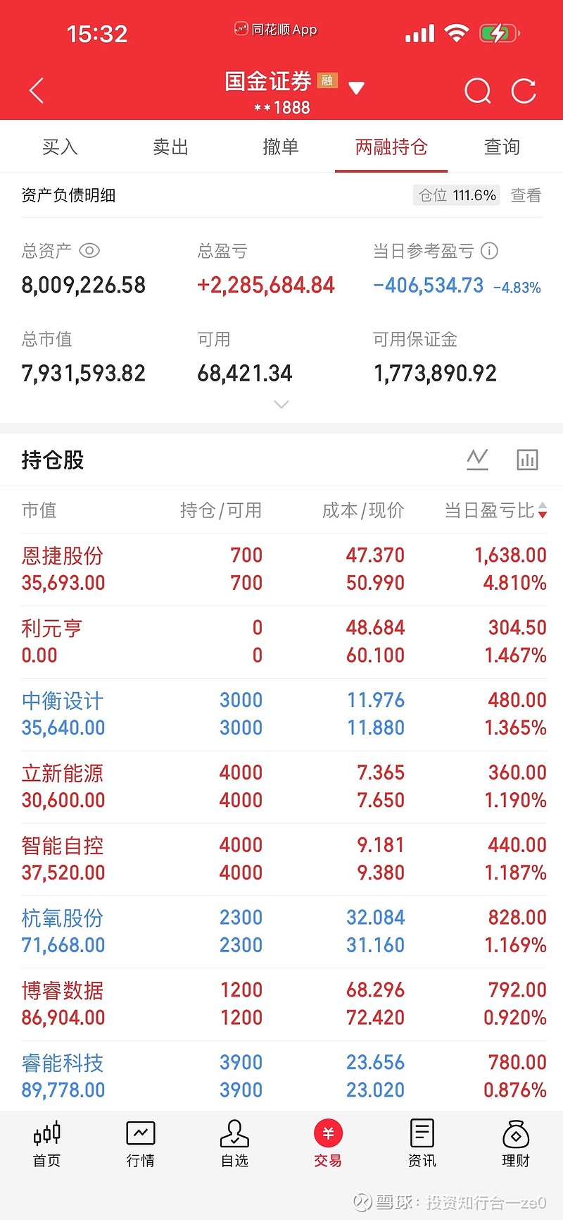 今日亏损88.1万,今年累盈116.3万元。融资负债227万元,净资产约1526万元。今日录得本人炒股以来最大日亏损,也是创了本人的历史了,盘中最多亏损110多万,收盘减少了点损失。