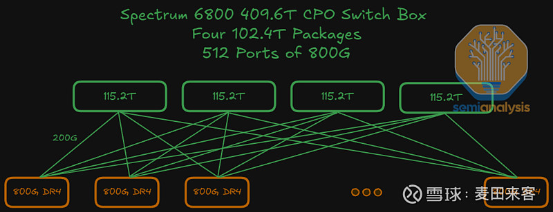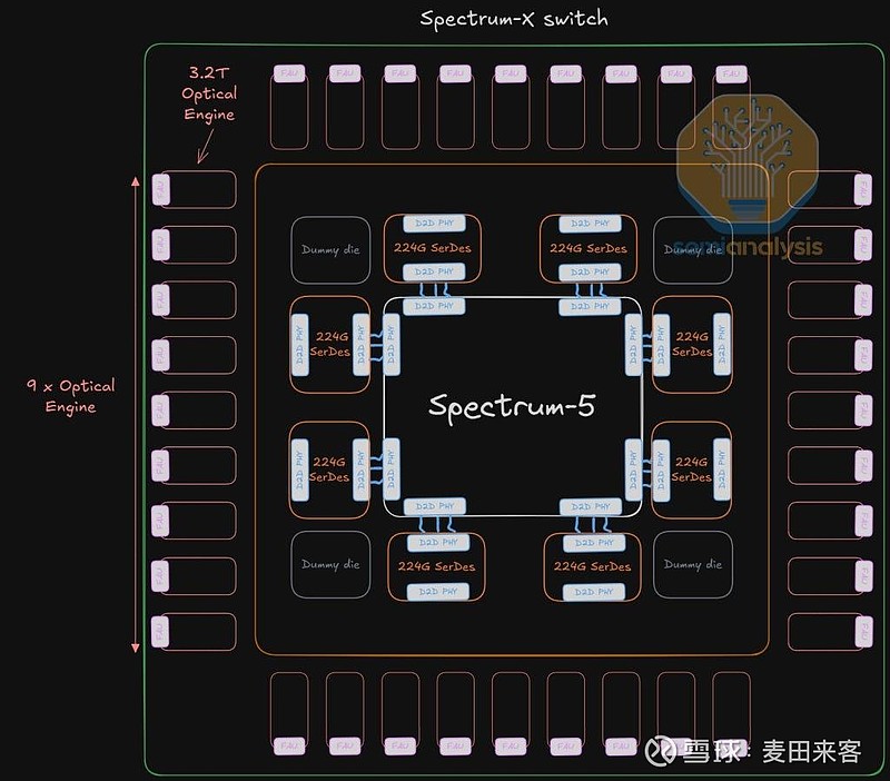 QuantumX800-Q3450共封装光学(CPO)交换机采用多平面架构设计,搭载四颗独立的交换芯片封装,且每一颗交换芯片封装均为一枚单片式裸片,内部集成了28.8T交换专用集成电路(ASIC)、所需的串并收发器(SerDes)及其他电气元件。与之不同的是,Spectrum-X光子交换机的芯片方案为多芯片组件(MCM),其核心是数枚掩膜尺寸更大的102.4T交换专用集成电路(ASIC),四周环绕着八颗224G速率的串并收发器(SerDes)输入/输出(I/O)芯粒——芯片的每一侧各部署两颗。