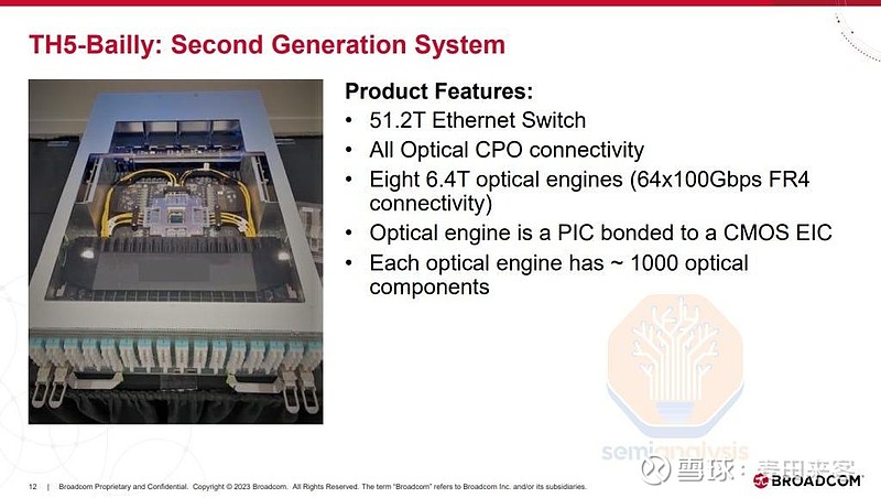 博通的第二代CPO设备贝利(Bailly)是一款总带宽达51.2太比特/秒的以太网交换机。与前代仅半数接口为光接口的设计不同,该设备的输入/输出(I/O)接口全部采用光接口方案。