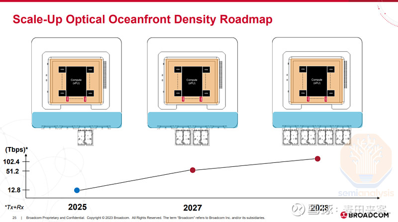 博通提出采用扇出型封装方案,将高带宽内存(HBM)布置在基板的东西两侧,从而为同一封装件内集成2个光引擎预留出空间。通过将封装工艺从晶圆上芯片(CoWoS-S)升级至大尺寸晶圆上芯片(CoWoS-L),可采用边长超过100毫米的基板。基于此,该封装方案将能够容纳最多4个光引擎,实现51.2太比特/秒的带宽。