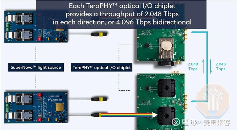 阿亚尔实验室(AyarLabs)的核心产品为其TeraPHY光引擎芯粒,该芯粒可集成封装至高性能处理器(XPU)、交换专用集成电路(ASIC)或存储芯片之中。第一代TeraPHY光引擎芯粒的单向带宽可达2太比特/秒,功耗仅为10瓦;第二代TeraPHY光引擎芯粒的单向带宽提升至4太比特/秒,同时也是全球首款遵循UCIe标准的光学重定时器芯粒,可在芯粒内部完成电/光信号转换,从而将主芯片信号以光信号形式进行后续传输。UCIe接口标准的选用,应能大幅提升该产品对客户的吸引力——因其具备标准化的接口,可便捷地集成至客户的主芯片之中。