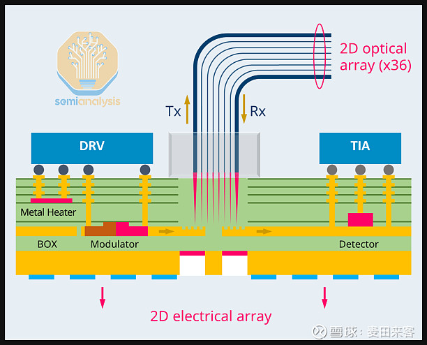 结合下方示意图来看:位于底部的绿色部分是光子集成电路(PIC),其内部集成了调制器、光电探测器与波导,上方则搭载了电子集成电路(EIC)。红色柱状结构为光纤,而容纳这些光纤的部件是一个玻璃块(即光纤接入单元FAU),该玻璃块同时起到光纤固定座的作用。光纤接入单元(FAU)的顶部设有激光钻孔,以此确保光纤的精准定位。通过采用二维光纤阵列技术,努比斯可在单块光子集成电路(PIC)上连接36根光纤(其中16根用于信号发送、16根用于信号接收、4根用于接入激光源),无需借助波分复用(WDM)技术,就能以更少的光纤实现更多波长的传输。这也使得努比斯的光纤接入单元(FAU)成为目前已量产的集成密度最高的同类产品之一。