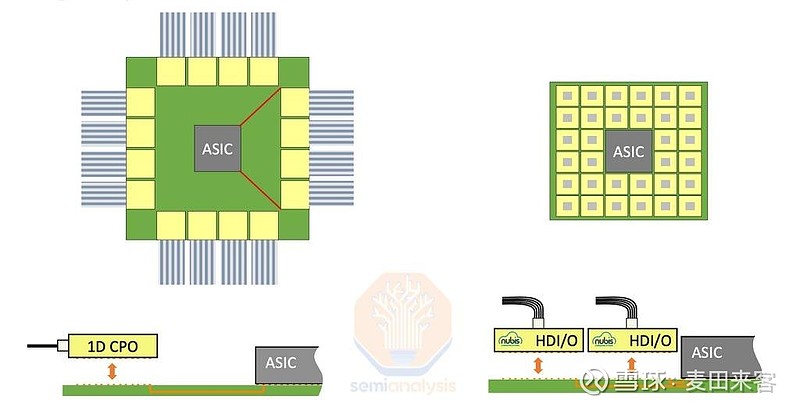 相较于边缘耦合技术,采用二维光纤阵列的另一大优势在于,可连接的光纤数量在物理层面所受的限制更小。从下方示意图中可以看出,借助努比斯的二维光纤阵列结构,只要封装条件允许,就能在专用集成电路(ASIC)的周围布置多排光引擎,从而提升带宽密度。