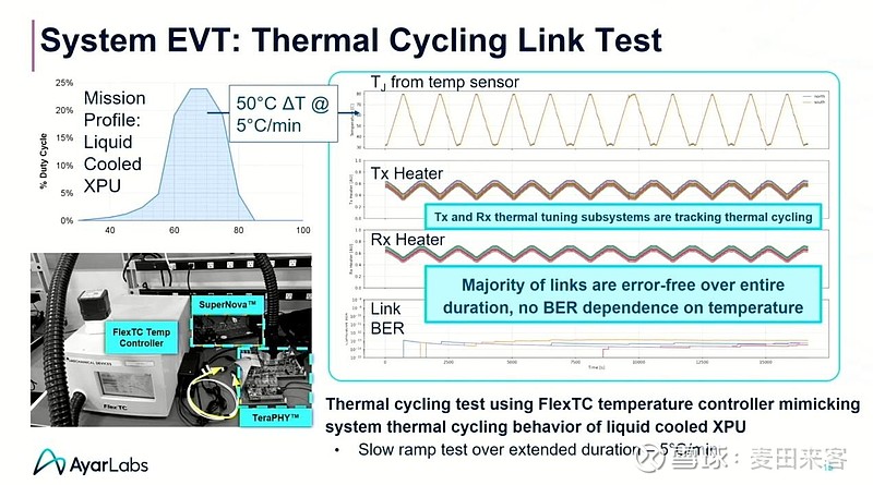 在2025年热芯片大会(HotChips2025)上,阿亚尔实验室公布了一项低速温度循环链路测试的结果——测试以约5摄氏度/分钟的速率进行了超4小时的温度循环,全程链路的误码率(BER)表现均十分稳定。