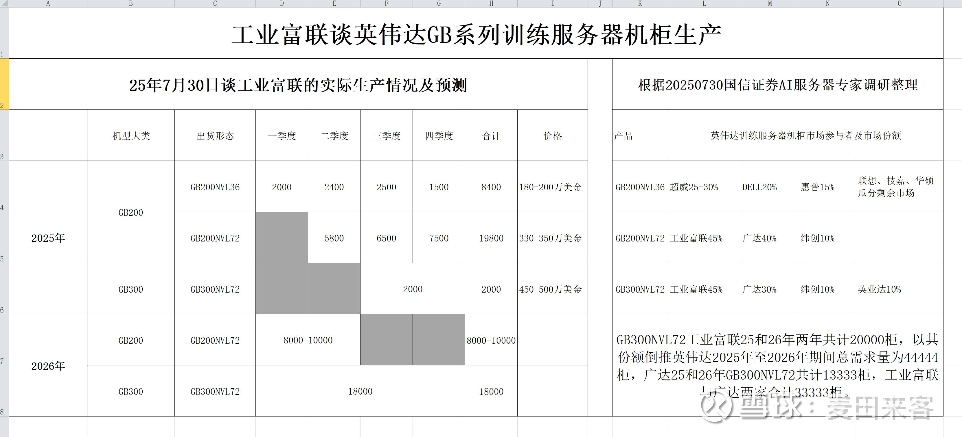 这一年来,关于英伟达、GB200、GB300服务器机柜等主体的调研纪要我看了百篇不止。今日经朋友帮忙,有信听到了2025年7月30日国信证券的一个小范围调研的录音。题目姑且叫《国信证券AI服务器专家交流会250730》。内容很长,涉及细节信息很多。站在目前这个时点,已经了解了一些事实与信息,也有过查询关单的经验,综合看这篇是可信度在近百篇中排名第一。受访者大概率就是鸿海集团的人。你们有渠道的建议找来听听。原文不放了,尊重人家知识产权。放一个自己存档用的简表,今年估计有机会来回溯。