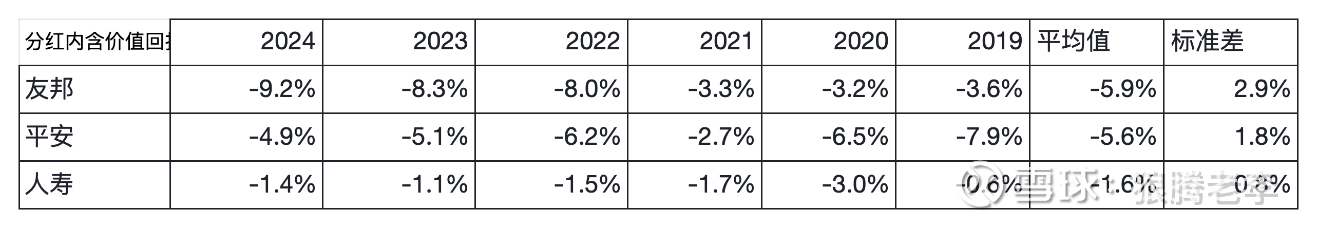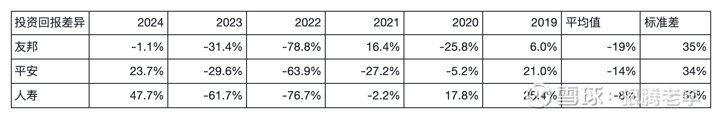 4、投资回报差异都有一定的影响,从2019年-2022年的数据来看,感觉标准差来看友邦和平安都好过人寿。而平均值友邦略差,但都是在可以比较的范围。这个数据是投资回报差异/内含价值运营溢利,就是友邦估值表格的第18项