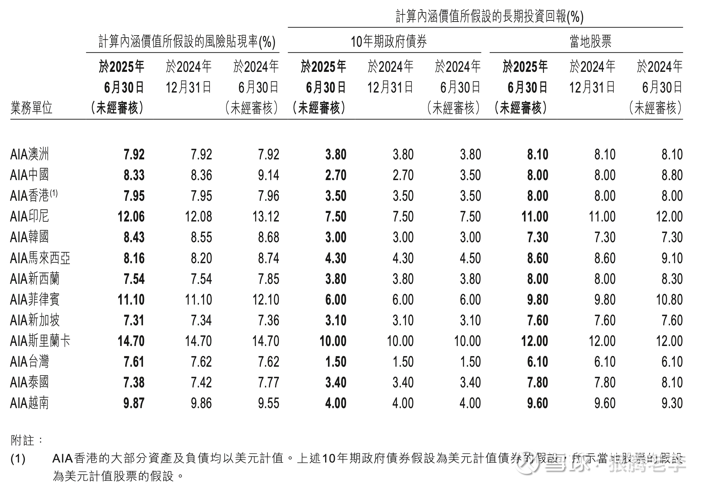 2、内含价值预期回报率基本上就是友邦的风险贴现率,在计算公式和各种经济假设没有大的调衡的时候,这部分的贴现率保持稳定,目前大概是8%左右。具体长期回报收益率和贴现率如下图。