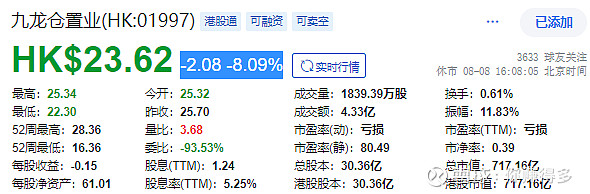 “九龙仓置业”股价在本周五出现大跌,一天内下跌超过8%的日子其实“非常罕见”。