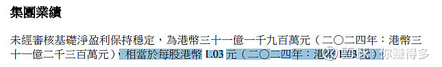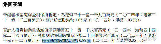 看“归母净利润”,一般来说,扣除投资物业公允值变动的数据更为“客观”。现在看:每股盈利是1.03港元,基本保持去年同期水平。这可能侧面反映“九龙仓置业”盈利已经出现稳定。