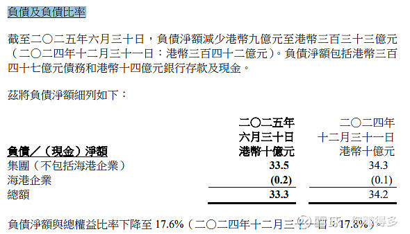负债由2024年中342亿港元下降到当前333百万港元,负债净额占净资产由2024年中17.8%下降到当前17.6%。