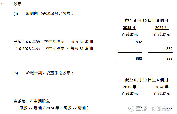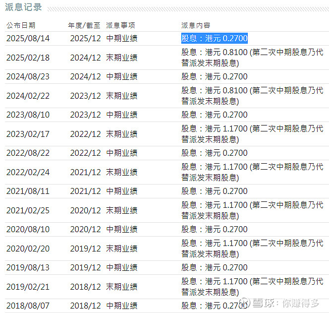 今年中期息是每股派0.27港元,这样的派息水平已经连续保持八年。