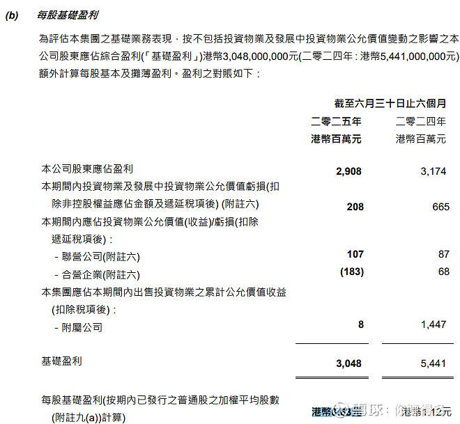 1、中期经营盈利(不含投资物业公允值变动)出现较大幅度下跌