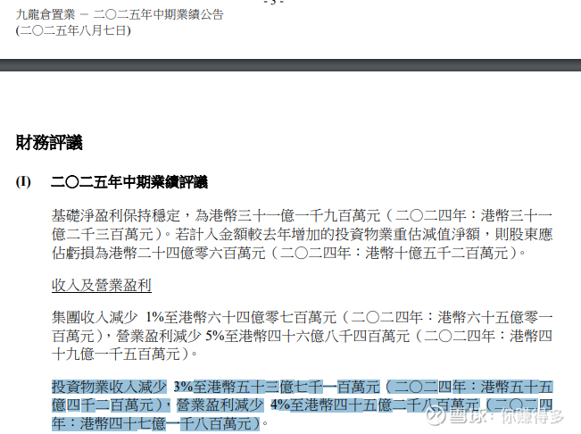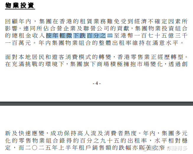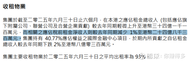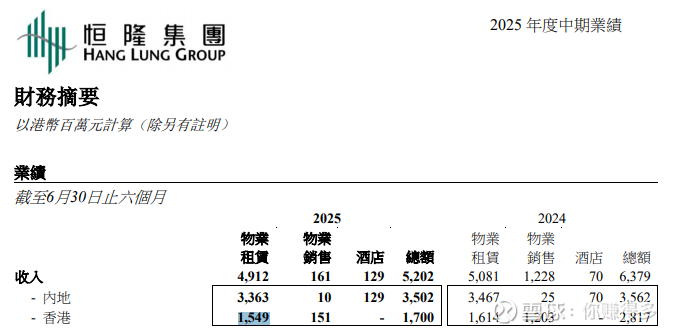 以香港租赁的“恒隆集团”为例,租赁营业收入是1549百万港元,去年同期是1614百万港元,这样看2025年中的租赁营业收入也是出现下跌。