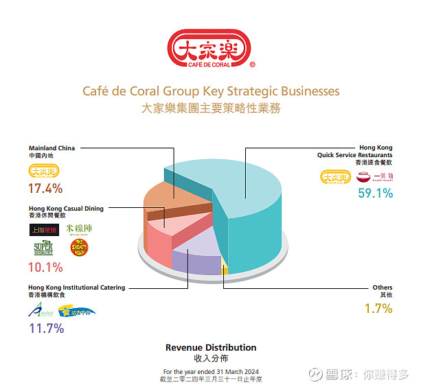 如果你到香港旅游,应该能看到路上醒目的“大家乐”广告LOGO,“大家乐”是香港具有行业领导地位的餐饮公司,旗下餐饮品牌众多(下图取自23/24年报)。