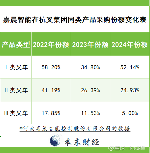 2022年,嘉晨智能对杭叉集团Ⅰ类叉车份额为58.20%,2023降为34.80%,2024年回升到52.14%。尽管2024年有所回升,但2023年的暴跌揭示份额极不稳定,波动剧烈。