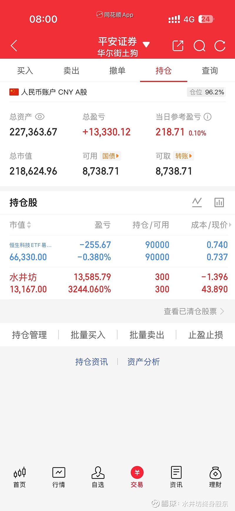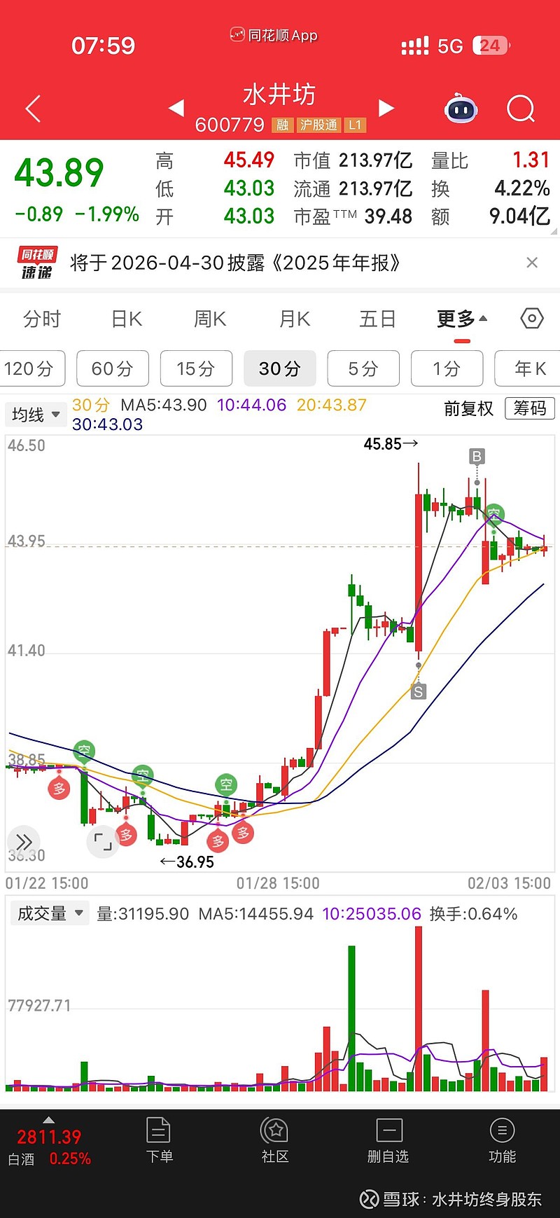 昨天贵州茅台涨3.36,水井坊在水下趴了一天,消化一些筹码,我感觉这个位置还得震荡,上面有套牢盘,下面还有一部分获利盘,要么极速下杀,要么就震荡,昨天是冲高以后回落慢慢震荡,说明上面还是有压力,上一个涨停是12亿成交量,我感觉震荡到6亿的时候,或者6亿以下成交量可以继续接回来。现在成交量已经很高了,有一段时间6000 万,一个股票无论涨也好跌也罢,这都无所谓,最怕的就是没人玩,其实没人玩的时候只要有基本的逻辑支撑,就是进场最好的时候#水井坊#