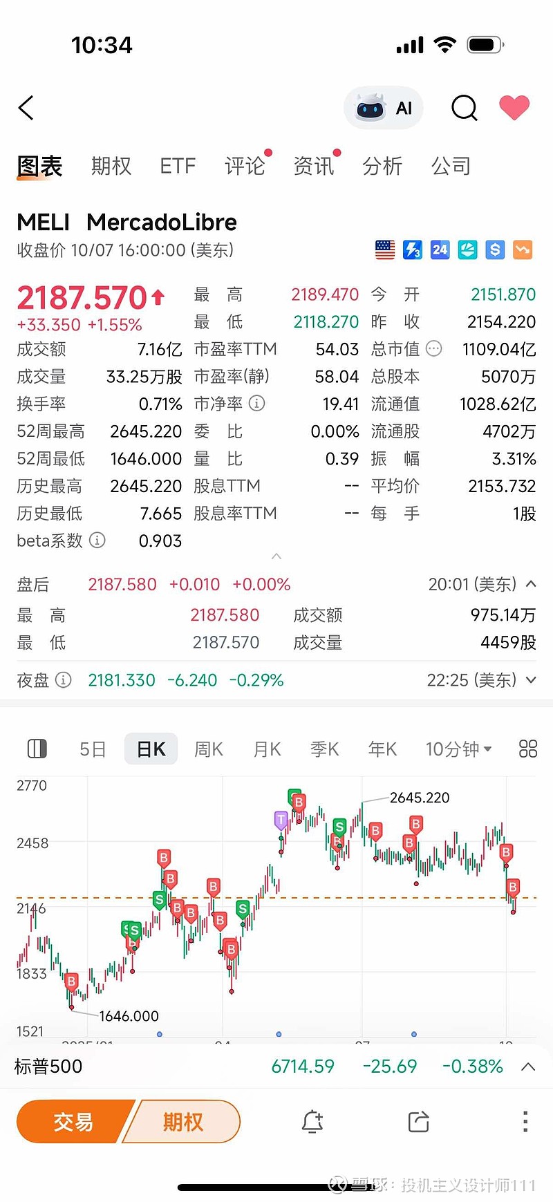 最近又是阿根廷大选的风波,又是巴西关税的风波,还有竞争对手$Sea Limited(SE)$ 和$亚马逊(AMZN)$ 在巴西的发力,股价连着大跌,倒不是特别担心。拉美的电商市场还很广大,公司的营收一直保持高速增长。现在的估值已经跌到4倍市销率(以今年270亿营收测算)。以如此增长速度而言,我觉得这公司未来达成近千亿营收和百亿净利润概率很大。所以就趁现在大跌补点仓。$MercadoLibre(MELI)$