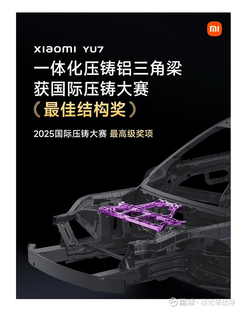 $小米集团-W(01810)$在北美压铸协会上,小米YU7 20合1 一体化压铸铝三角梁获2025 International Die Casting Competition (2025 国际压铸大赛) 最佳结构奖,也是该大赛的最高级奖项。北美压铸协会(NADCA)是北美地区年度规模最大、专业性最强的压铸行业展会。