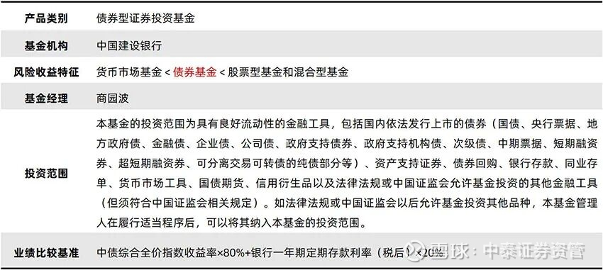 本基金拟任基金经理是商园波,现为中泰证券资管固收公募投资部副总经理。上海财经大学金融学硕士,2006年起,历任上海银行理财业务交易员、投资经理,国泰君安资管固定收益投资经理,中泰证券资管固定收益投资经理、金融市场部副总经理、基金业务部副总经理,历经牛熊转换,投资经验丰富,秉持严控风险原则,为持有人求稳求赢。