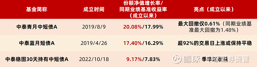 中泰青月中短债A/C于2019.8.9成立,2021-2025年度份额净值增长率分别为3.65%/3.23%、2.44%/2.06%、3.17%/3.01%、3.00%/2.83%、1.57%/1.41%;同期业绩基准表现为3.27%、2.49%、2.61%、3.43%、1.25%。2021.6.22,该产品增聘臧洁为基金经理,2021.11.22,张蓓蓓卸任该产品基金经理。目前该产品的基金经理为商园波、臧洁。中泰稳固周周购12周滚动债A/C于2021.7.21成立,2021-2025年度份额净值增长率分别为1.56%/1.43%、2.45%/2.14%、3.91%/3.60%、3.44%/3.13%、1.87%/1.57%,同期业绩基准表现为1.78%、1.99%、3.95%、8.07%、1.50%。2023.2.7起,该产品增聘邹巍为基金经理,田瑀卸任该产品的基金经理。2025.12.22,该产品增聘程冰为基金经理,邹巍卸任该产品基金经理。目前该产品的基金经理为商园波、程冰。